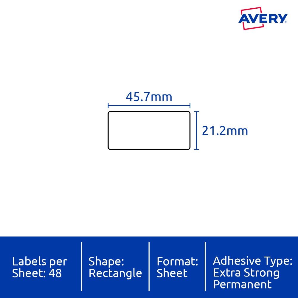 • Size: 45.7x21.2mm 480 labels, 10 sheets. 48 labels per sheet (48UP).