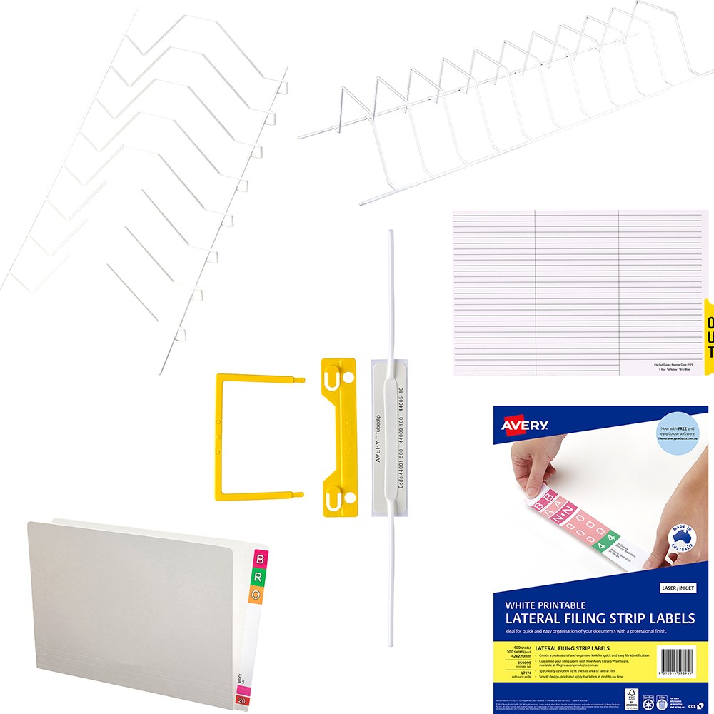 • Includes 5 of 900X390mm File Racks, (40448), Straight Edge File Rack (40461), 600 Foolscap White Lateral Files (46503), 600 Tubeclip® Fasteners (44009Y), Outguides Pack Of 25 (41546) and 800 Avery Lateral Filing Labels (959095).