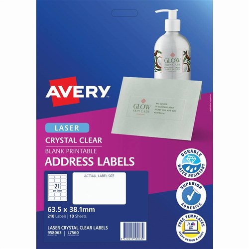 Avery Crystal Clear Laser Address Label 21UP 63.5x38.1mm 210 Labels 10 Sheets