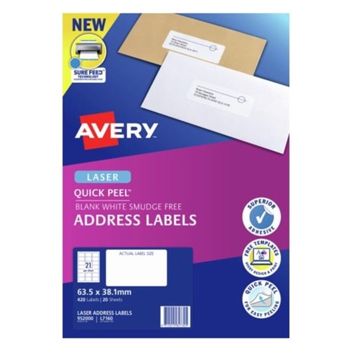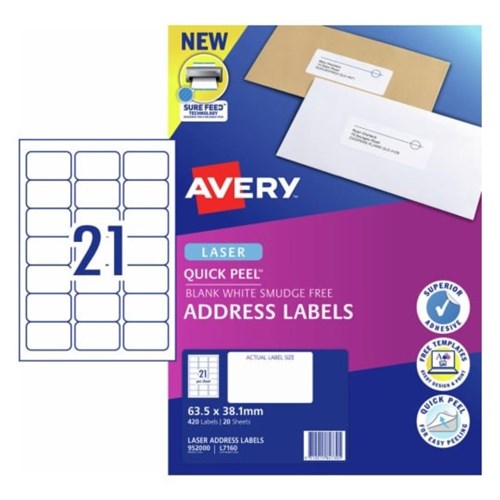 • Size: 63.5x38.1mm 420 labels, 20 sheets. 21 labels per sheet (21UP).