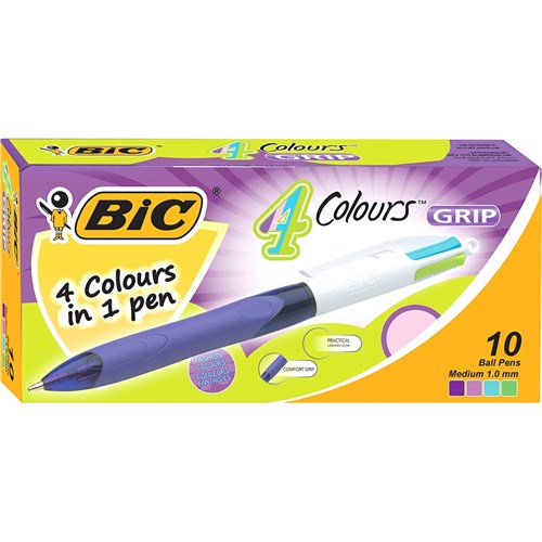 BIC 4 COLOUR GRIP PEN Fashion Green Blue Pink Purple Box of 10
