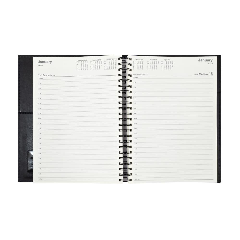 • Ideal for those 'on the move' with its double wiro binding and heavily grained metallic and matt PU cover.