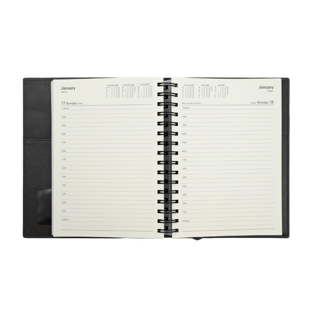 • Ideal for those 'on the move' with its double wiro binding and heavily grained metallic and matt PU cover.