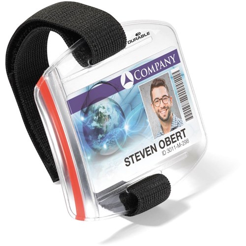• An adjustable arm strap with hook and loop fastening that can be used on outside of clothing for ease of walking around enables ID cards and passes to be securely fastened and highly visible at all times.