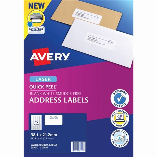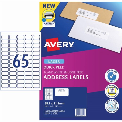 • Size: 38.1x21.2mm 1625 labels, 25 sheets. 65 labels per sheet (65UP).