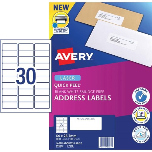 • Size: 64x26.7mm 3000 labels, 100 sheets, 30 labels per sheet (30UP).