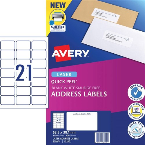 • Size: 63.5x38.1mm 2100 labels, 100 sheets. 21 labels per sheet (21UP).