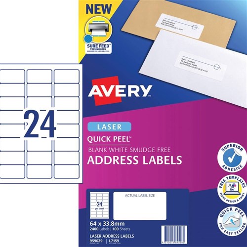 • Size: 64x33.8mm 2400 labels, 100 sheets. 24 labels per sheet (24UP).