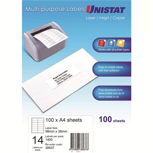 • Size: 98x38mm 1400 labels, 100 sheets, 14 labels per sheet (14UP).