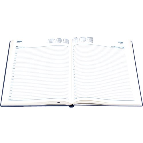 • Stylish hardcover casebound diary with blue leather grain cover.