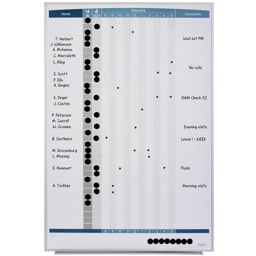• Quartet Matrix In/Out boards are an ideal space saving way to keep track of personnel.
