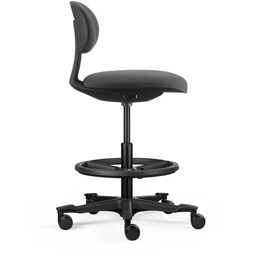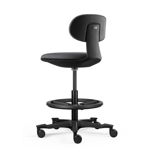 • A height-adjustable sit-stand chair. The moulded foam seat and back and the nylon base with castors ensure user comfort and easy mobility.