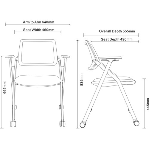 • Arm To Arm: 640mm. Floor To Top Of Arm: 665mm. Overall Height: 835mm. Overall Depth: 555mm.