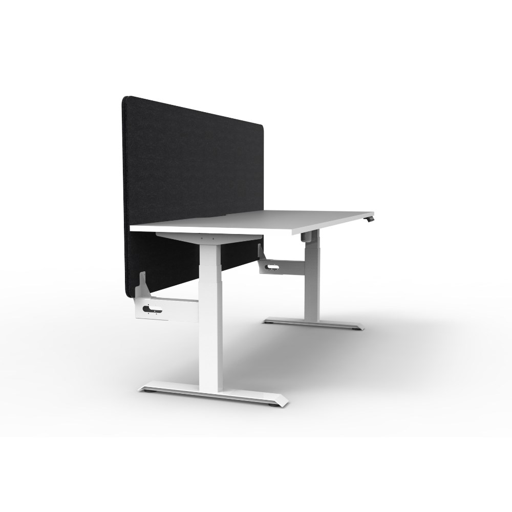 • Electric height adjustable single sided workstation with Natural White top and White Satin frame, Black Eco screen.