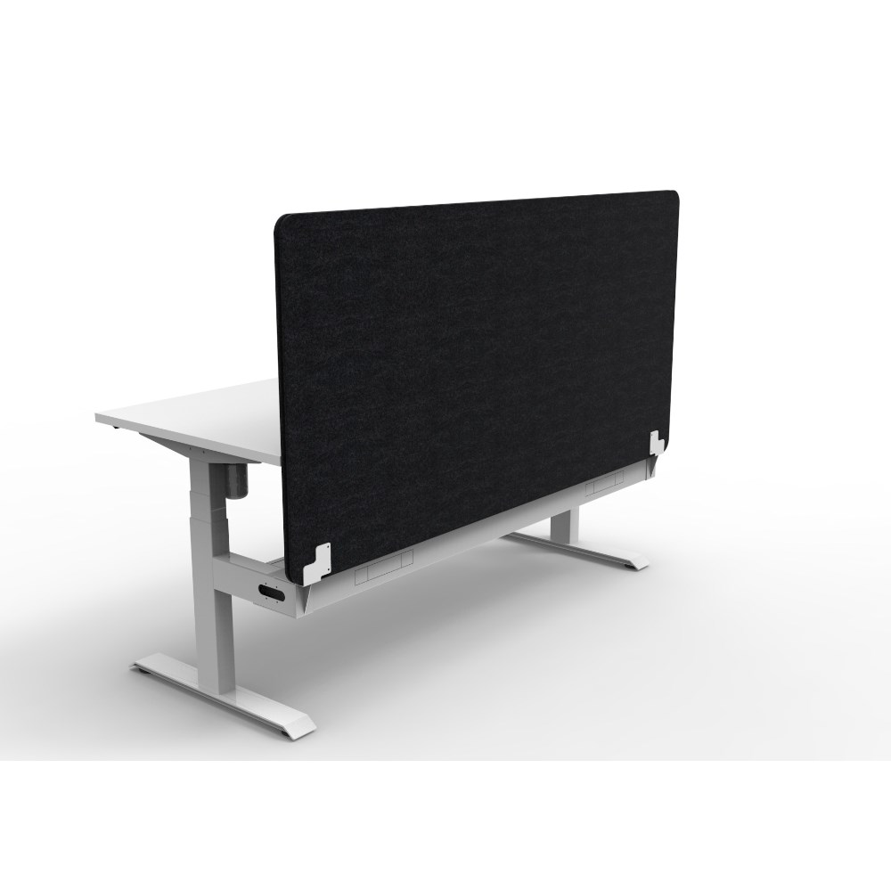 • Electric height adjustable single sided workstation with Natural White top and White Satin frame, Black Eco screen and cable tray.