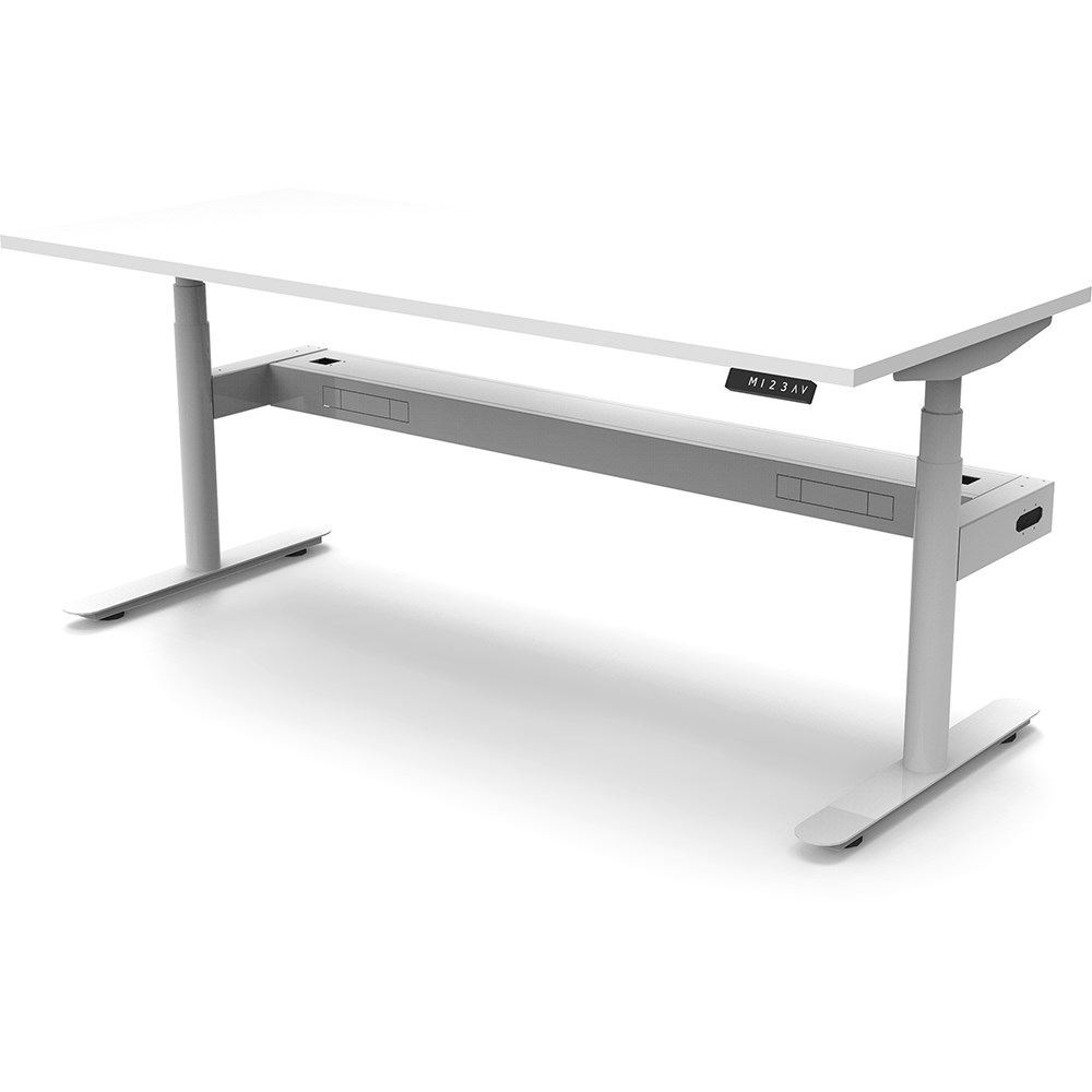 • 70mm diameter round column legs. 700mm wide foot size with adjustable leveling feet, return foot: 700mm. Comes with cable tray for cable management.