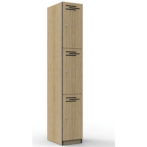 • RAPIDLINE MELAMINE LOCKER 3 DOOR 305W x 455D x 1850H NATURAL OAK WITH BLACK
