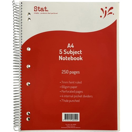 STAT NOTEBOOK A4 7MM RULED 60Gsm Red 5 Subject 250 Pages