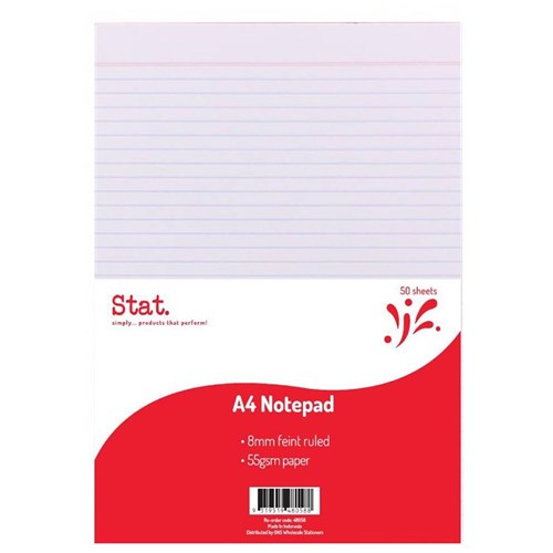 STAT NOTEPAD A4 8MM RULED 55Gsm White 50 Sheet